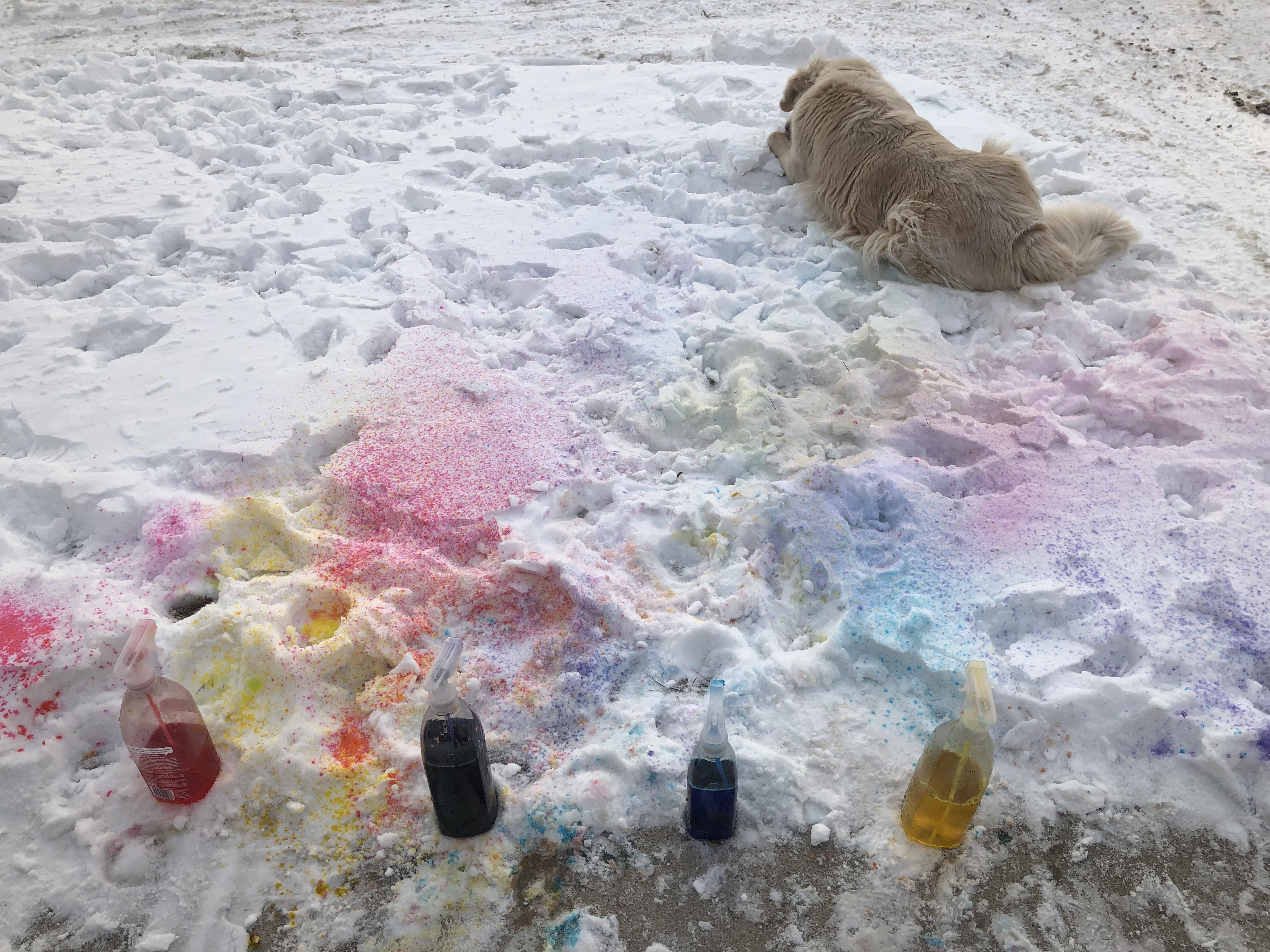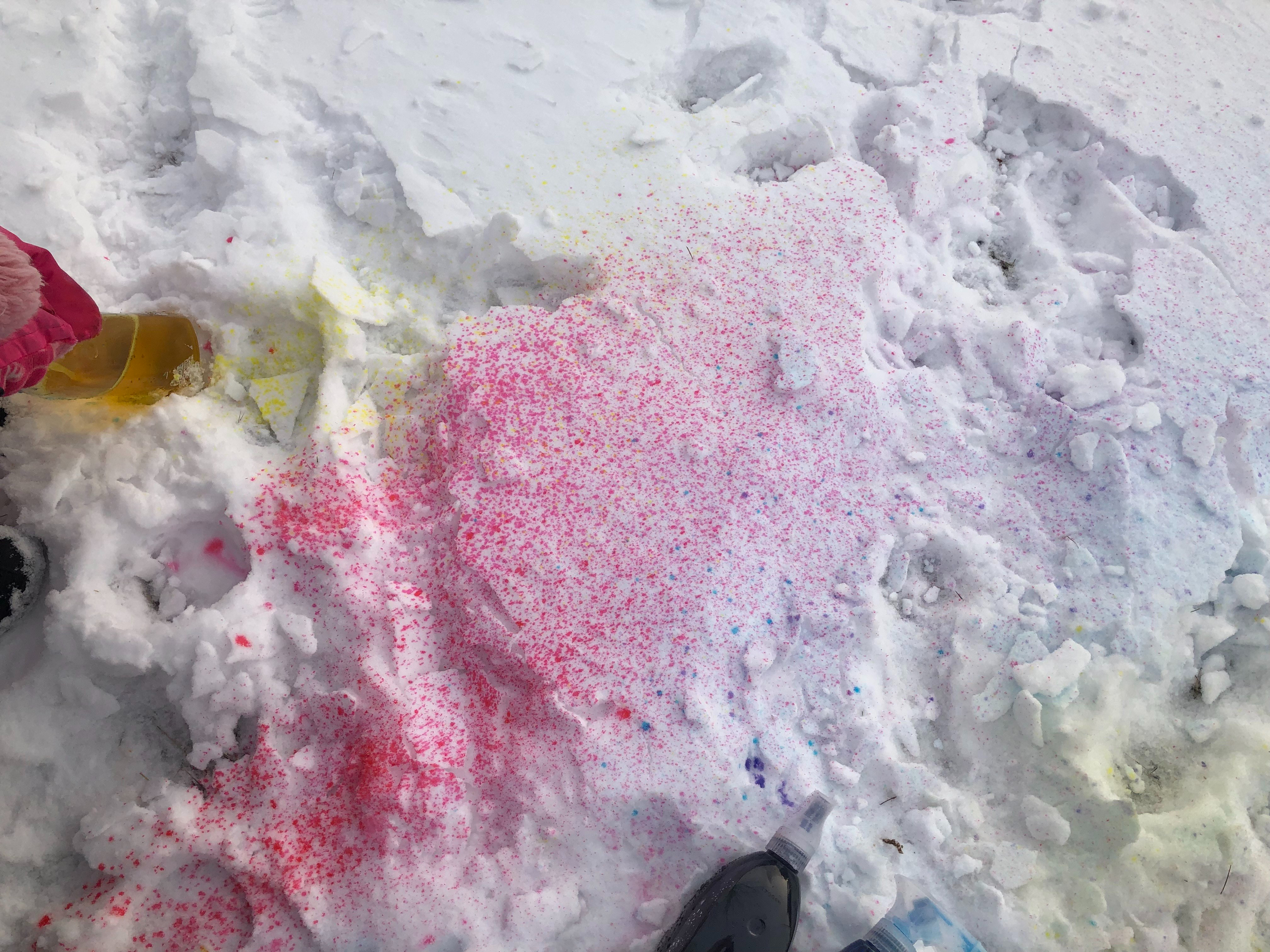 One of the snow activities that keeps the kids occupied and you can easily mix it in with other snow activities is painting the snow. I have done this activity many times with the kids and they always ask for more.
