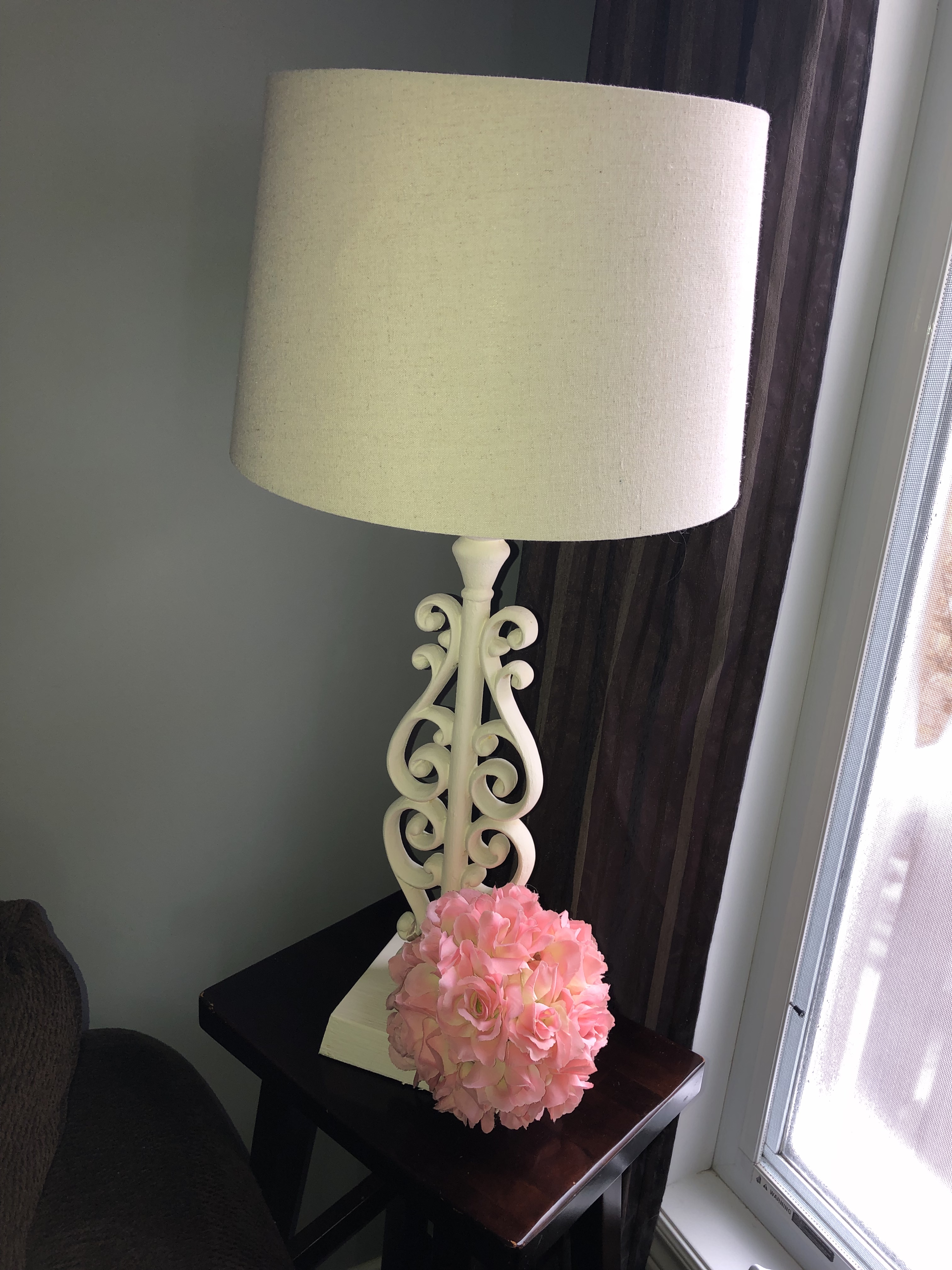For the side table beside my couch which is an old stool that I am using. It has a lamp on it, with soft pink bouquet that my daughter had at my sisters wedding.