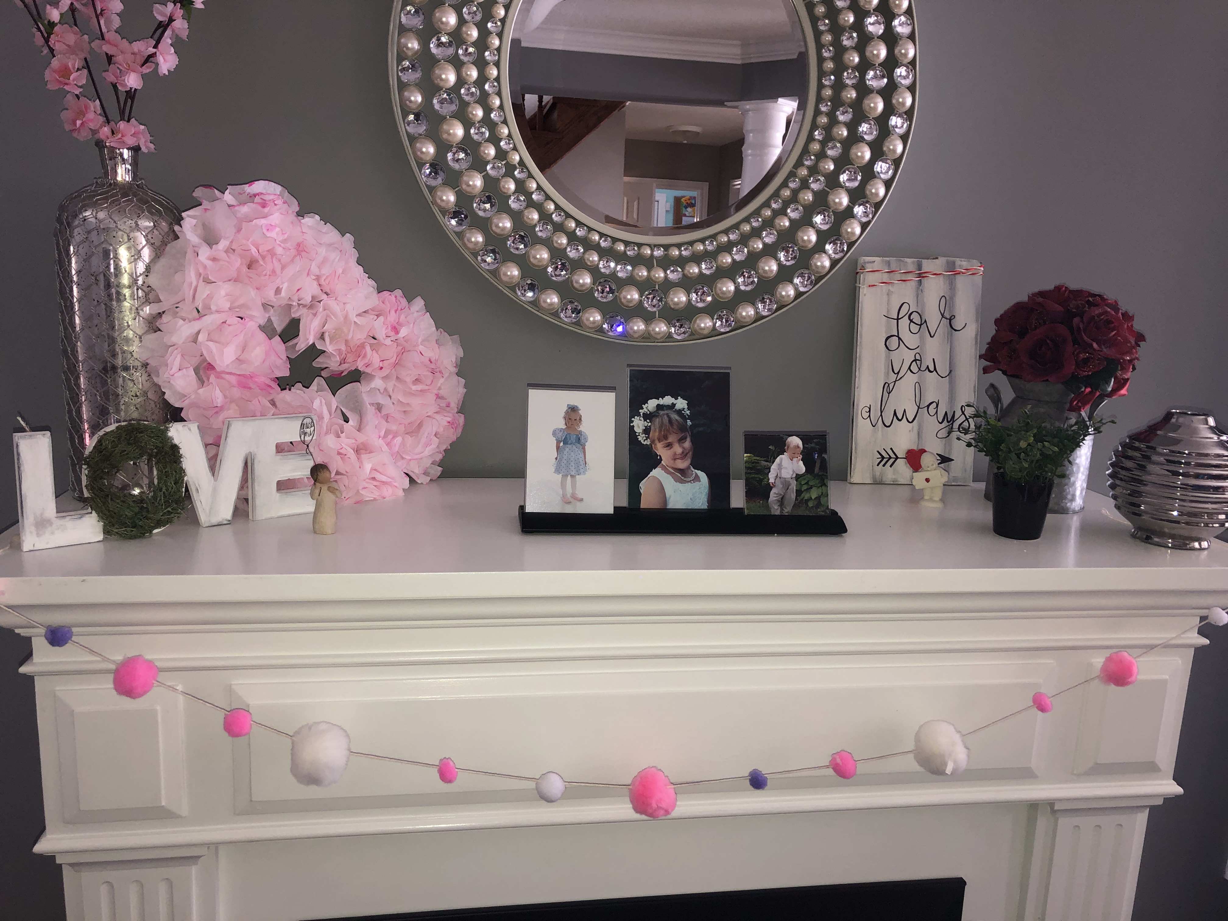 The fireplace which is a focal point of the room I decorated with different textures like wood, tin, glass and florals. I also added a pom pom garland which was a lot of fun to make. If you would like to see how I made some of these decorations you can watch my video here