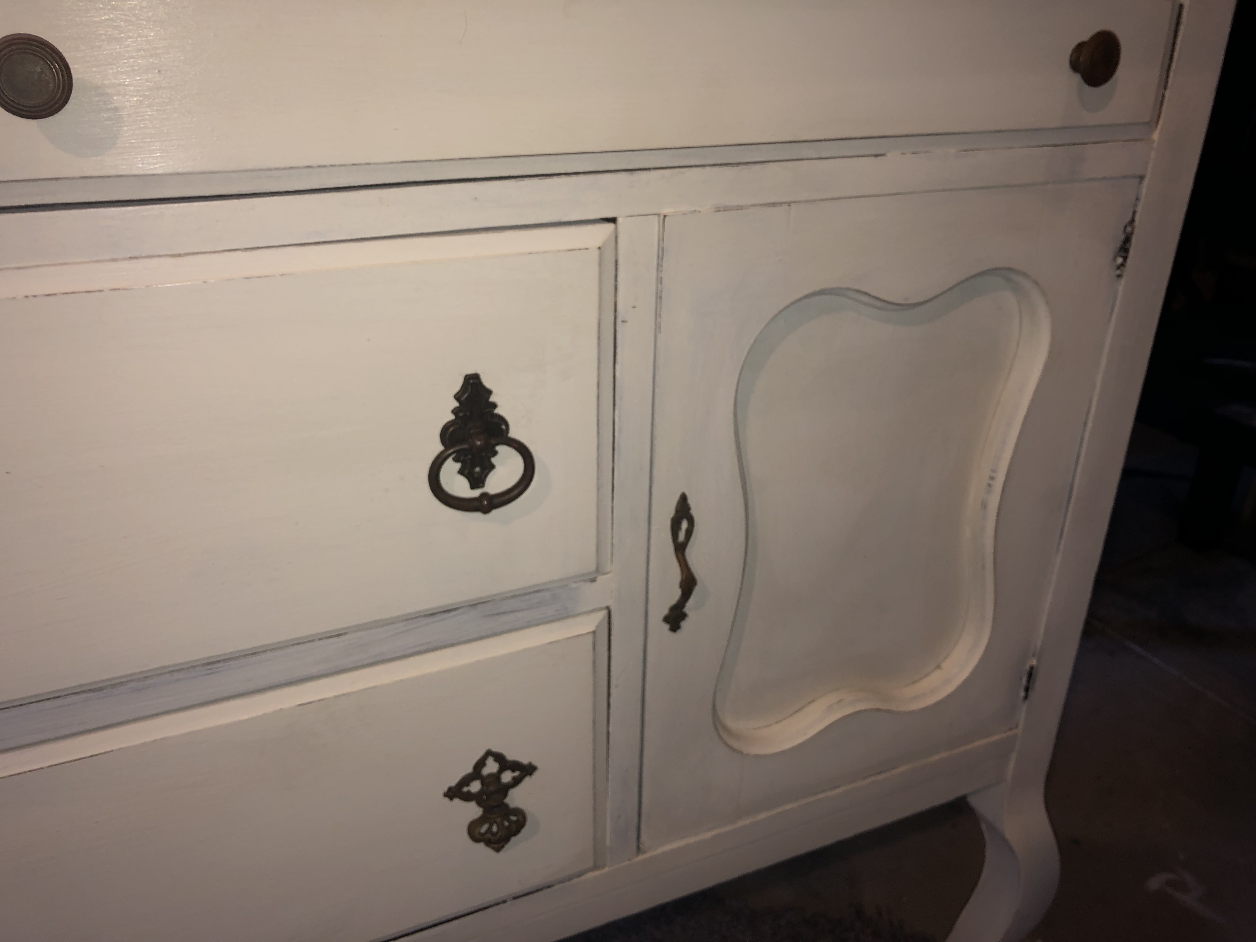 While on my one of many Thrifting trips I picked up this beautiful buffet or sideboard. It was a steel at only $75.00. I brought it home and it sat in my basement for several moths while I took time deciding what I wanted to do with it. I have done two other upcycles of a similar style sideboards where I used many different techniques and different colours and waxes. For this one I was leaning more into just a simple white. I had Old White on hand so I decided to go with that. I am really into the farmhouse look these days and thought painting it all white would fit that decor.