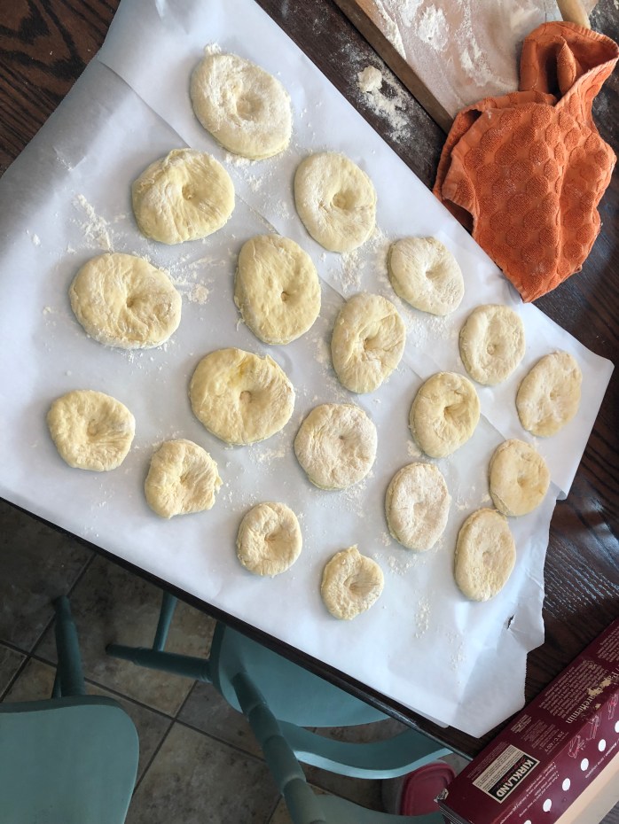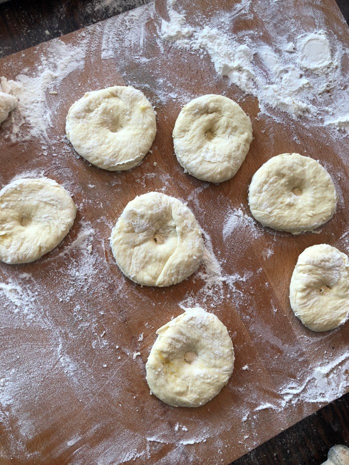 Roll out the dough on a well floured surface. You might want to flour your hands before you transfer the dough because it will be sticky. Roll it out and cut out circles. I used a small bowel for the larger doughnats and a glass for smaller ones.