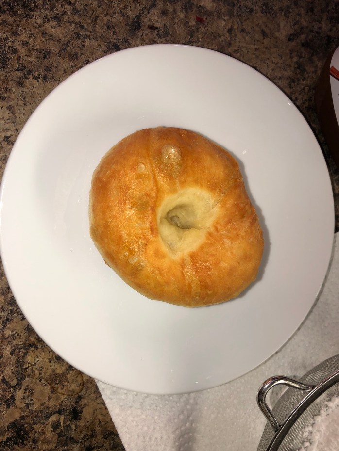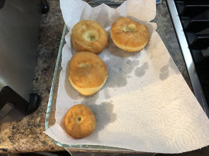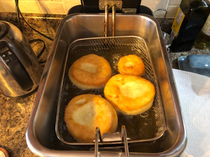 Preheat your oil to around 375C. I used a deep fryer and I totally recommend using one as well. In case you don’t have one make sure you can measure your temperature and make sure it is 375C. If the temperature is not hot enough and you put your donut in you will have an oily donut because it will drink the oil. When oil is the right temperature it almost seals it, so the oil doesn’t get in. The cooking should take only about 2 to 3 minutes a side.