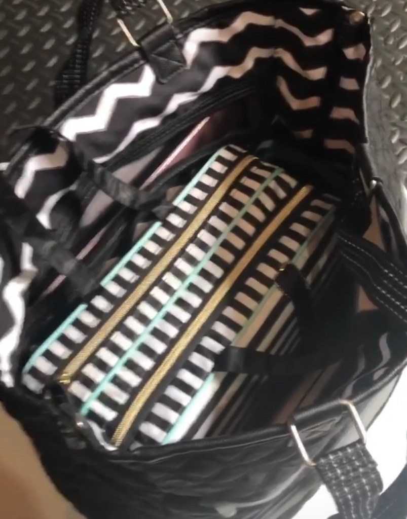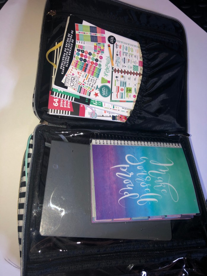 I place my planner bag inside Thirty one Double Take Tote https://www.amazon.com/dp/B075GGPG46/?ref=idea_lv_dp_ov_d&tag=aiponsite-20&linkCode=ic6&ascsubtag=amzn1.ideas.1Q0HGWM39QO8F and I also add my computer, charging cables, reading material, headphones and vlogging camera (just in case). This ends up being pretty heavy but I only take it from car to the hotel and wise verse. I like using this bag because once I am at the hotel I unpack it and when going to the pool or dance venue I can just take what I need in it. Nice thing is it has a cooler built in so I can pack lunches or snacks in it as well or just put water in it depending how long we are there for.
