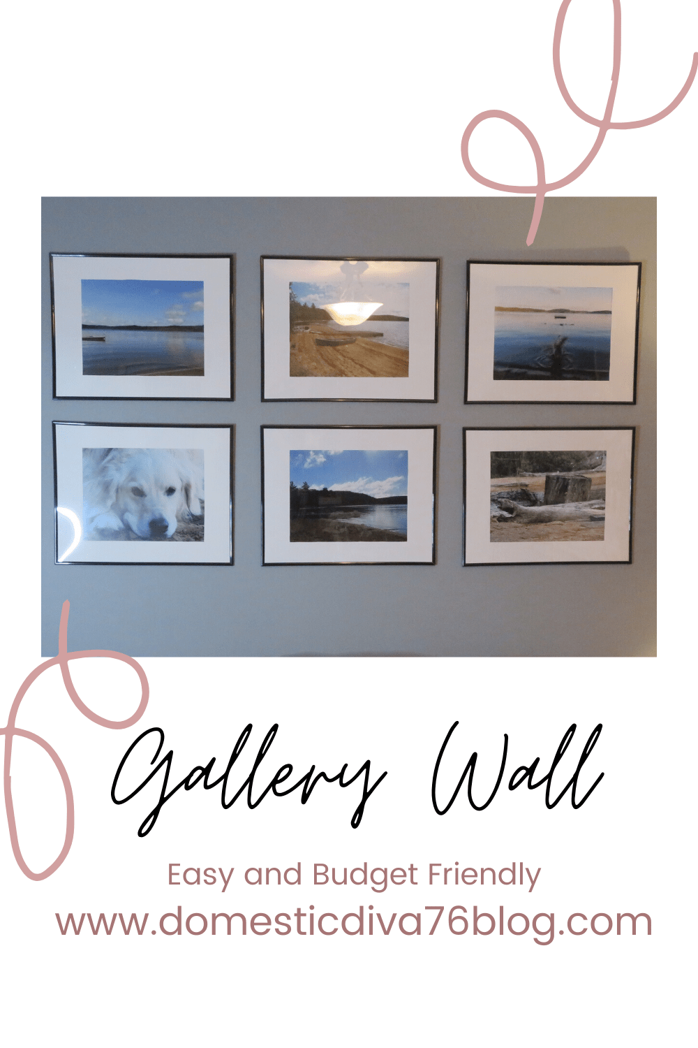 I decided to create a memory wall for a summer cottage that we vacationed for almost ten years at every summer. Not only was it our favourite place to visit and relax as well as enjoy the lake as much as we could, It was my goldenās as well. He spend hours and hours of swimming in the lake. Once I got all my matting cut out and picture frames assembled it was time to put it up on the wall. I used the paper that came inside of the frame to map out my wall and figure out where I wanted to put up the frames.