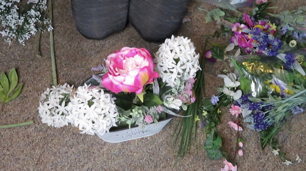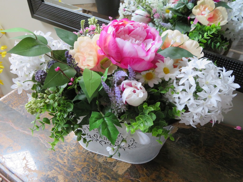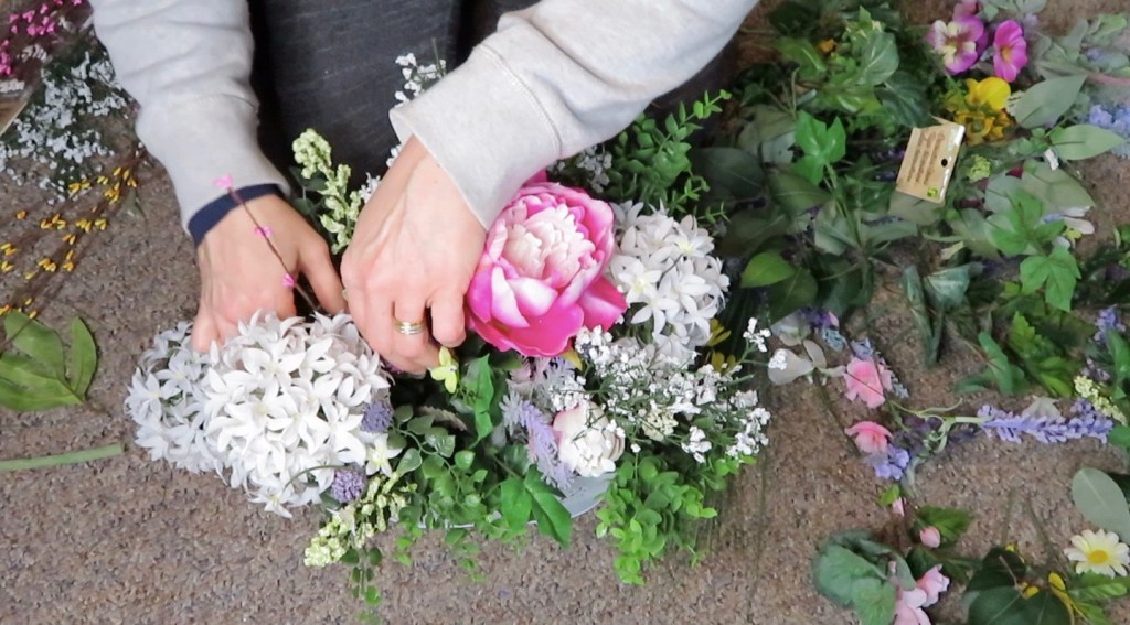 Once your foam is in place it is time to add your flowers. I am not a professional florist but have done enough arrangements to know what works for me. I start with my focal point in this case it was my Peony and than I work around it. I add similar size items and usually try to add in odd numbers.