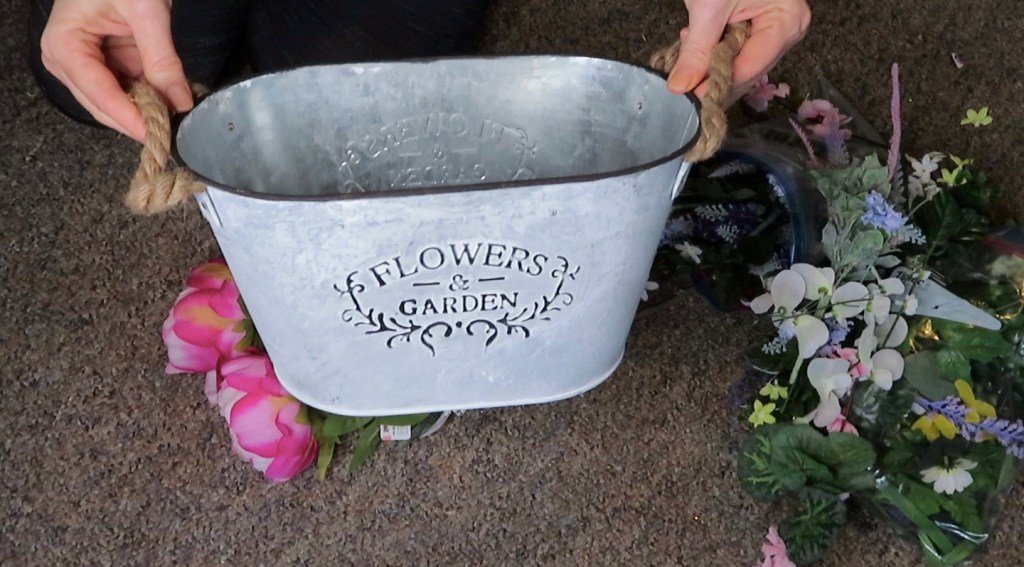Once you have decided which florals you will be using you need to pick a bucket or a vase that will be the appropriate size. I choose this one that came from Dollarama and I absolutely love the farmhouse French rustic look it has and for $4.00 it was a steel.