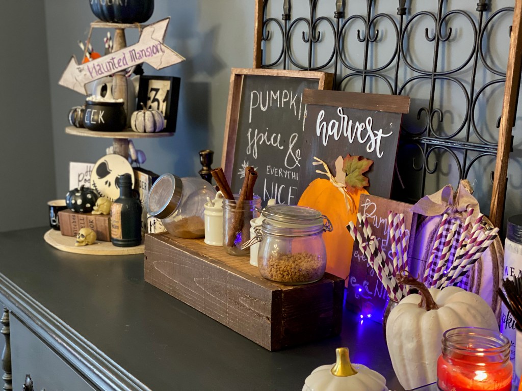 This year I said I wasn’t going to be doing any Halloween decorating. But here I am sharing a post on my Halloween Home decor. Since I no longer have young children at home I wanted to make it spooky but not overboard. I am going to start with my bar cart that was one of my favourite in my Halloween Decor this year. I decorated it for my Book Club since the book was a bit spooky and I though it would be the best fit for that.