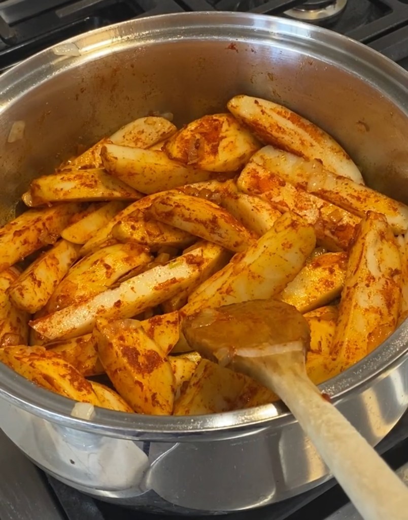 Add the sliced potatoes to the pot and stir well, letting them cook for about 5 minutes. This step allows the potatoes to absorb the flavors from the onions.