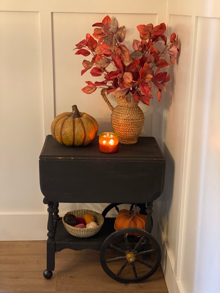 For the entryway, I wanted a charming yet functional space. The console table features layered vases, fall florals, and pumpkins for texture and warmth. Recently, I swapped out the artwork for a vintage landscape framed print, inspired by a Hobby Lobby piece that isn’t available here in Canada. This swap instantly gave the space a timeless, collected feel while keeping the seasonal charm.