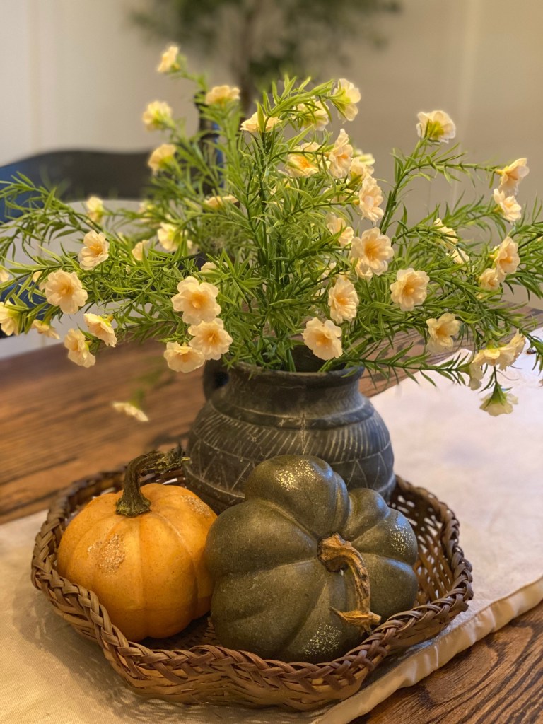 The dining room is where I leaned into classic fall elegance. I created a simple centerpiece with natural florals, candles, and a touch of seasonal greenery. Layered textures on the table make it easy to transition from everyday dining to a festive fall dinner. The overall look is warm, timeless, and perfect for gathering with loved ones.