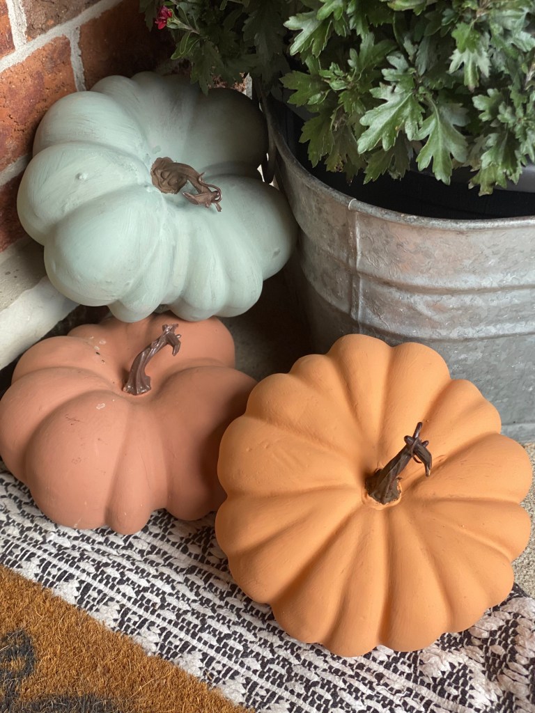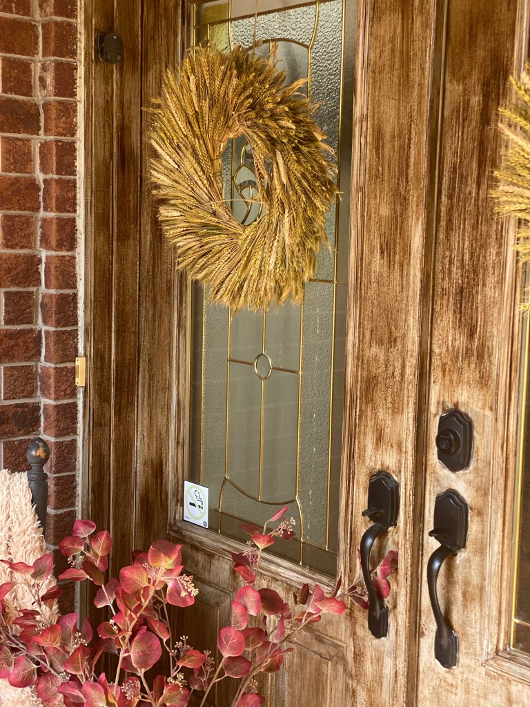 Your guests’ first impression begins at the front porch, so I kept this space welcoming and simple. I layered seasonal pumpkins in different sizes and shades for a natural look, paired with rustic lanterns and fall greenery. A cozy doormat and wreath completed the entry, creating an inviting first step into the home.