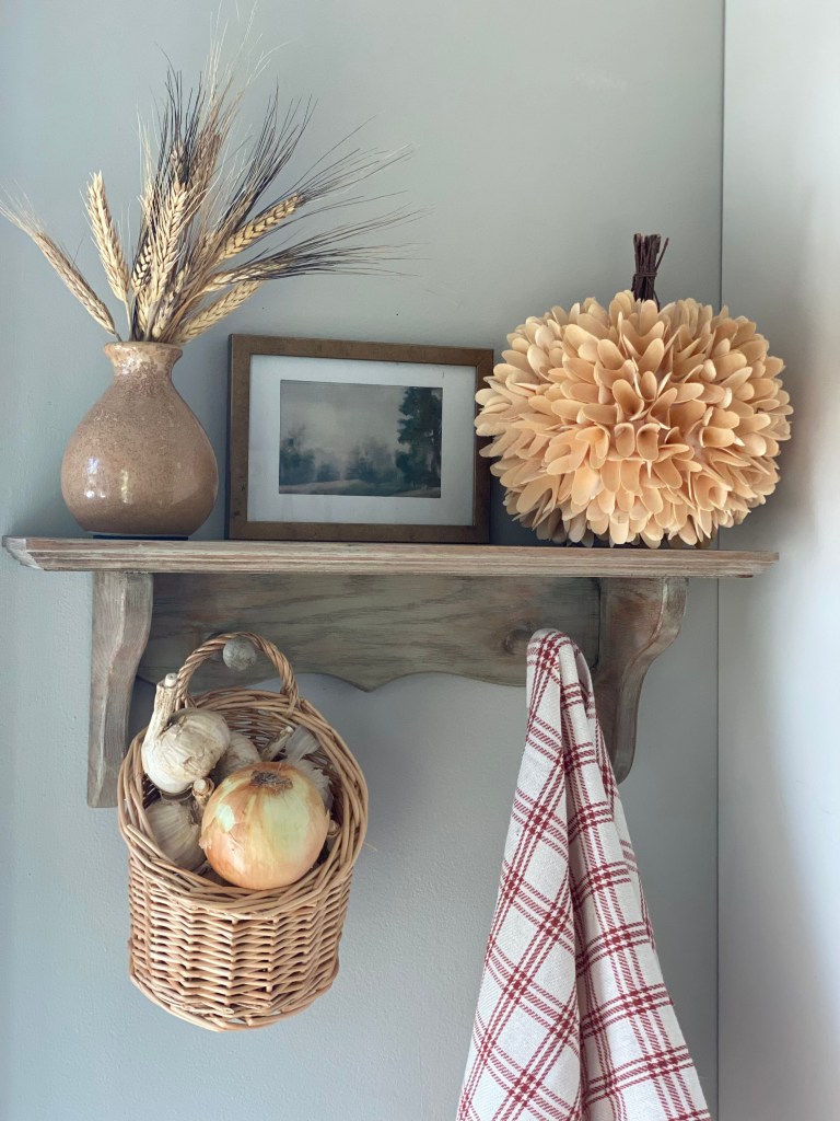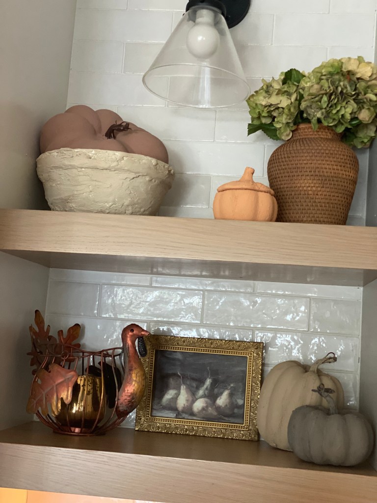 In the kitchen, I kept the décor simple and functional. I styled a cozy coffee station with hints of fall—warm mugs, seasonal florals, and subtle autumn accents. A few pumpkins and wood tones tie everything together without overwhelming the space. This is where function meets style, creating a space that feels lived-in yet seasonal.
