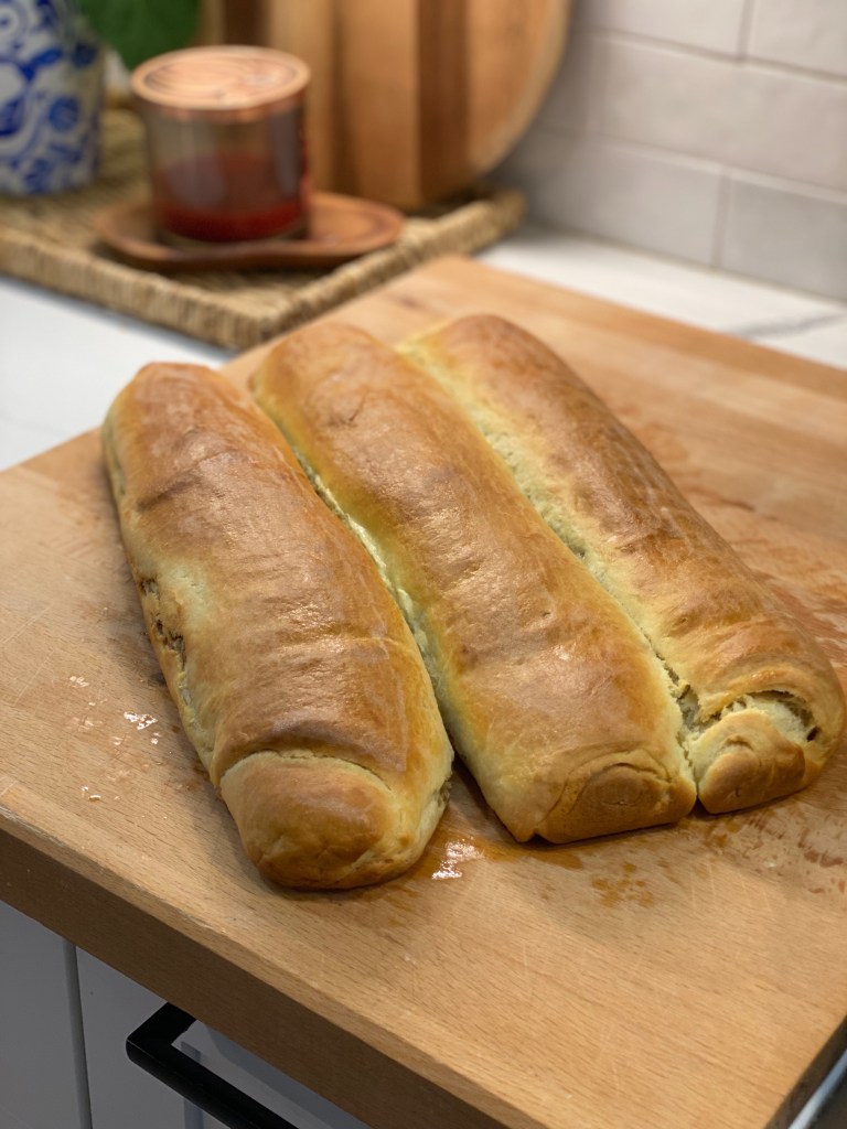 Divide your risen dough into three equal sections (or according to your pan size). Roll each piece into a thin rectangle. Spread the walnut filling evenly, leaving a tiny border at the edges. Roll the dough up tightly and place it into a pan lined with parchment paper.