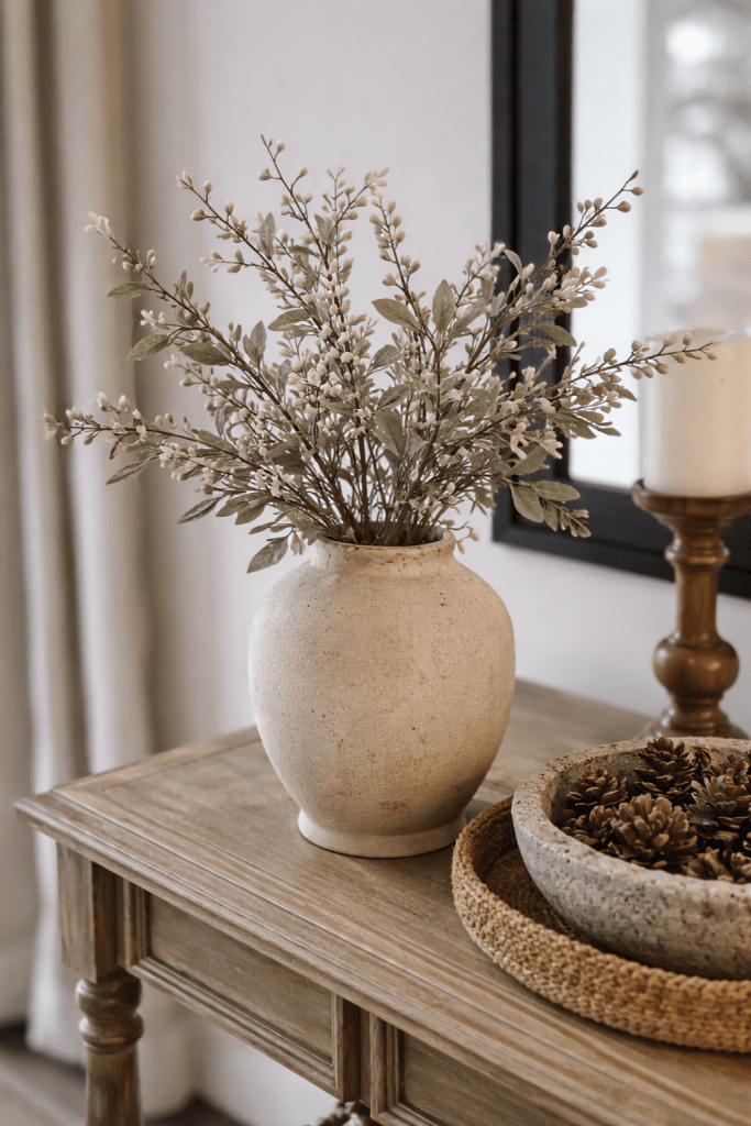 Winter decorating doesn’t have to mean starting over completely. Instead, I like to edit what I already have and lean into pieces that feel seasonal without screaming holiday. Winter stems are perfect for this because they: