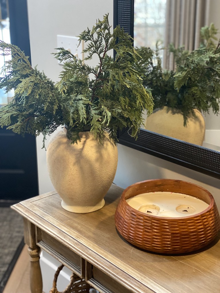 In today’s post, I’m sharing my favorite winter stems for decorating after Christmas, how I use them throughout my home, and why mixing faux and real greenery works so well for winter decorating.
