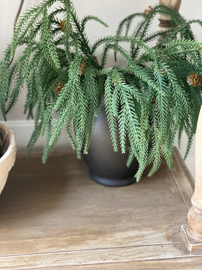 Norfolk pine is a winter staple in my home. These stems don’t feel overly Christmas-specific, which makes them perfect for winter decorating. I love how structured yet soft they look, especially when layered together.